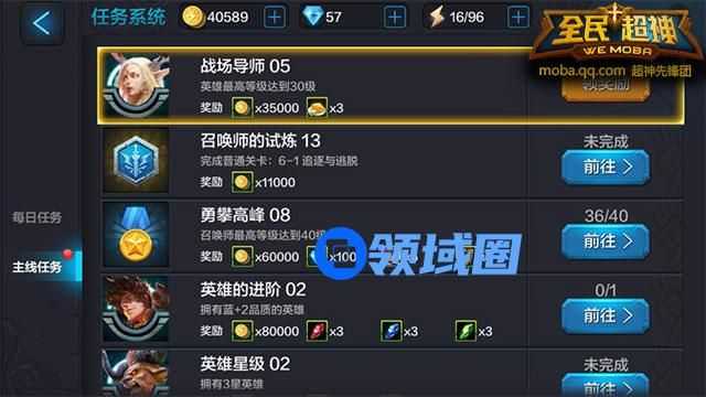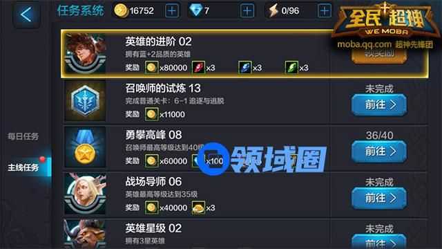 在《全民超神》中,任务系统能给玩家带来丰厚的收益,包括海量角色成长经验值、珍稀道具、钻石、金币等。任务系统又分为主线任何和每日任务,主线任务中的每一个任务都仅限完成一次,每日任务则是每日都会重置更新。