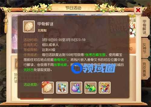 甲骨解谜是《梦幻西游》手机游戏特别推出的限时节日活动。玩家只需通过游戏中的节日按钮点击甲骨解谜游戏,即可到元好古区领取相关任务。接下来,只要玩家每天积累100个活动,就可以得到一张考古宝藏图片,用来获取兽骨碎片的神秘故事线索。
