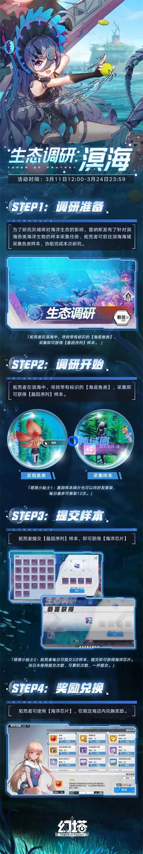生态调研溟海是幻塔即将在3月11日开启的最新活动,玩家可在玩法中尽情探索海洋的秘密,许多未知的宝藏在等着你发现,这次被给予了任务,可在活动期间活动大量的海洋芯片,可用海洋芯片兑换活动商店奖励。海洋芯片获取途径很广泛,其一就是在海洋中寻找有标识的鱼类生物,即可从它们身上获取名为基因序列的样本,将其提交给系统,将得到大家想要的海洋芯片,这次活动商店除了能得到上限为3的赤核,海洋能量晶尘、时空晶碎等材料,可助变得更强,接下来为大家说明一下幻塔生态调研溟海活动介绍。