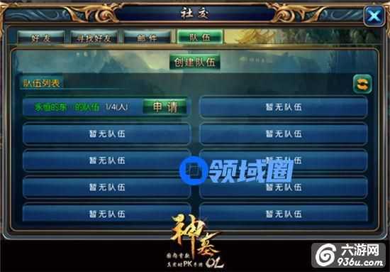 点击某人组队后,会向对方发出组队申请,当对方同意后,即可组成一个队伍。我们也可以通过打开右下方的【社交】功能按钮,选择【队伍】,进入别人的队伍或自己创建队伍,当自己已经有队伍时,这里可显示队伍成员。