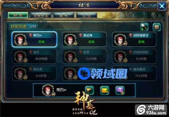 点击某人选择【交友】后,即向对方发送好友申请,如果两人已经是好友,则进入好友界面,好友界面显示所有的好友列表,并且可选择某个在线好友进行【组队】、【寄信】、【私聊】的操作。