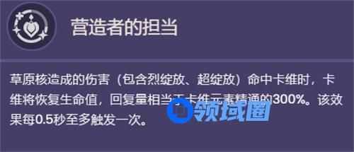草原核造成的伤害(包含烈绽放、超绽放)命中卡维时,卡维将恢复生命值,回复量相当于卡维元素精通的300%。该效果每0.5秒至多触发一次。