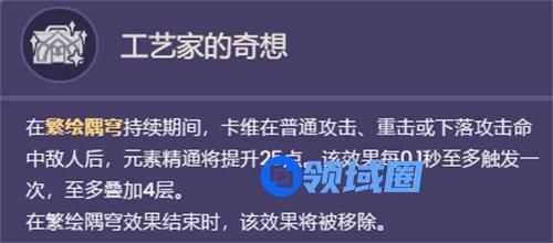在繁绘隅穹持续期间,卡维在普通攻击、重击或下落攻击命中敌人后,元素精通将提升25点。该效果每0.1秒至多触发一次,至多叠加4层。