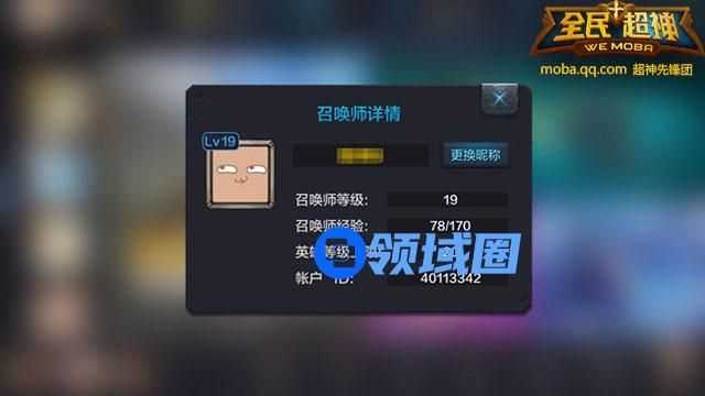A板块:玩家个人头像、召唤师昵称和召唤师等级,以及等级经验值比例。点击头像后还能看到数值,以及个人账户ID,账户ID可在游戏中直接用于添加好友。