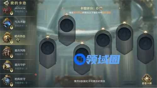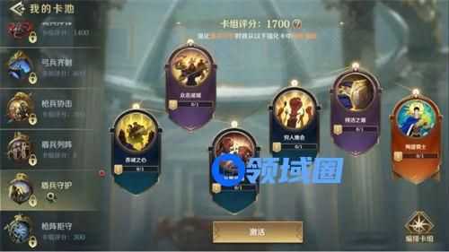强化卡可以通过文明遗迹、联盟任务商店、战功排行等活动获取,分为蓝、紫、橙、红四个品质,领主大大们可任选6张组成自己的卡组,激活预兆技能。