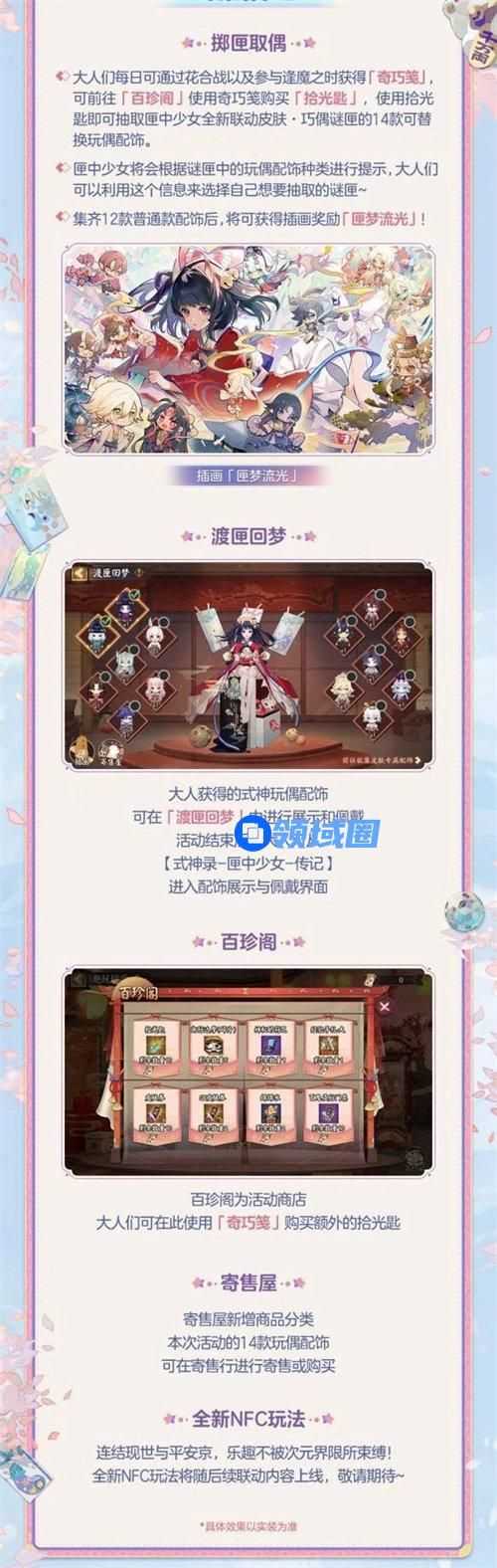 每日可通过花合战以及参与逢魔之时获得「奇巧笺」,可前往百珍阁使用奇巧笺购买「拾光匙」,用于抽取匣中少女新皮肤·「巧偶谜匣」配饰。