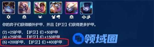 更关键的是能让慎释放技能后的3次普攻可造成其护甲值的250%真伤,我们给其搭配6护卫羁绊,慎就能拥有400(6护卫)+50(本身护甲),这就能让慎的3次真伤造成1125的真实伤害,且这个伤害是固定值,哪怕是1星慎也能造成这个伤害。