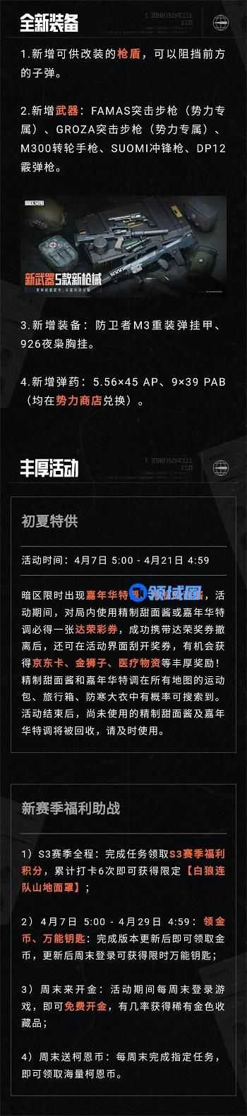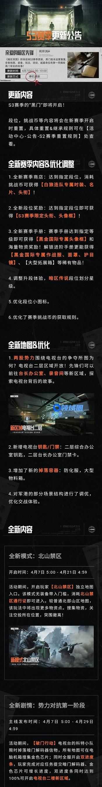 3、黑门版本已在2023年4月7日01:00到10:00期间,停机更新,带来S3赛季的“黑门”版本更新,全新的地图、装备、玩法、活动等你来体验;