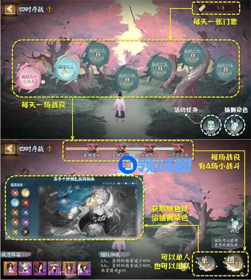 四时序战是即将在4月12日更新后开启的活动挑战,许多玩家目前可能还不熟悉该怎么完成挑战,本次活动可单人也可组队,我个人是建议玩家组队,单人基本是给有实力玩家挑战自我的,稳妥一点也好。通过挑战获取颜色球,并集齐10种颜色即可得到精美的插画,可以说这次大家认真对待的话,每个人都能成功解锁插画,每天会提供一次挑战机会,可积累到3张的上限一口气打完,玩法还是比较简单,搭配适合的阵容组队完成任务。积累参加几天顺利结束,轻松无压力,接下来为大家介绍一下阴阳师四时序战活动攻略一览。