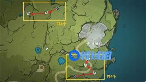 1、千风神殿右上角的位置可以刷取4个丘丘人,然后下方的位置上也是有4个丘丘人。