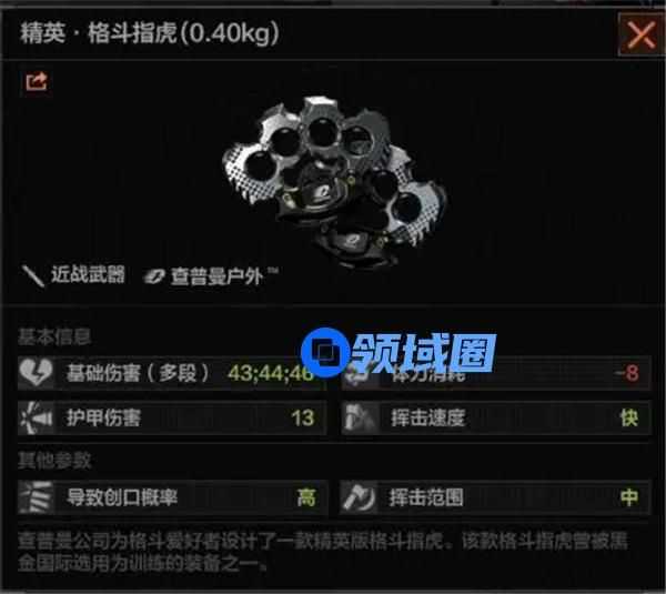 精英·格斗指虎是暗区首款双持近战武器,左右两只指虎的交替攻击大大提升了攻击速度,在将敌人饱以老拳后,最后再以一记上勾拳结束这场毫无悬念的战斗。