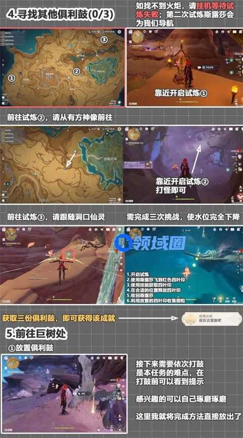 第三阶段就是敲鼓,有冰、雷、草、水、火五种不同元素的鼓需要敲击,全部完成后解锁成就“山上之树”。