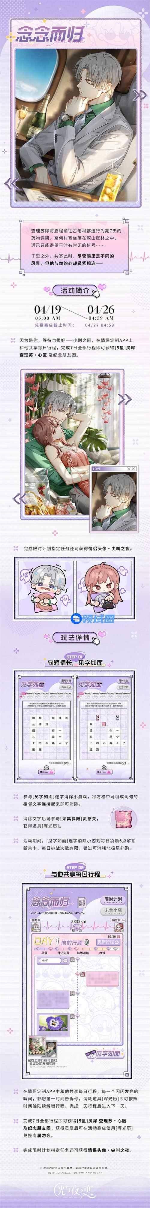 3、活动简介:因为是你,等待也很好——小别之际,在情侣定制APP上和他共享每日行程,完成7日全部行程即可获得[5星]灵犀查理苏・心匿 及纪念朋友圈。完成限时计划指定任务还可获得情侣头像・尖叫之夜。