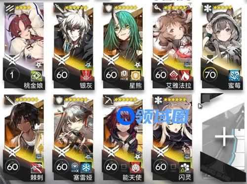 桃金娘、棘刺、银灰(1技能)、塞雷娅、星熊、能天使、艾雅法拉、闪灵、蜜莓(广域奶,疗养师或者行医都行)