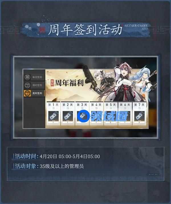 周年签到活动上线!35级及以上的管理员,可于活动期间(4月20日05:00-5月4日05:00)前往游戏内参与签到,累计签到7天,可共计领取精确探测凭证*10。