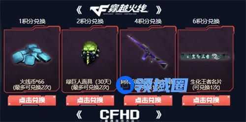 一积分可以兑换66火线币(最多兑换2次),2积分兑换绿巨人面具30天(最多兑换2次)。