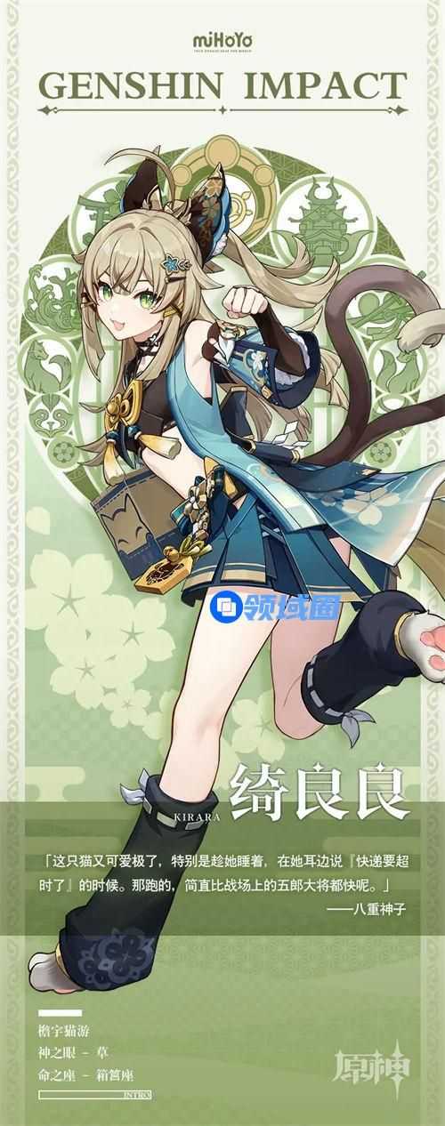 原神绮良良什么时候出?已经从官方发布的消息中可知,她将在3.7版本上线,经了解新版本可能将在5月24日左右上线,根据以往的版本更新日期推测而出,详细还是等官方后续的通知为准。绮良良的身影早在前段时间就有内鬼爆料会上线的消息,看来情报是属实的,该角色一看就是参考猫咪为题材设计的,全身都是猫咪的标志性特征,将以草系辅助定位的身份出现,外观可爱水灵,大部分玩家应该都会抽取,强度还不知如何,大家可期待下次的绮良良最新爆料,接下来为大家介绍一下原神绮良良上线时间一览。