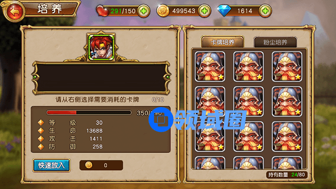 升级还需要足够的金币,这里你可以放心,因为升级所需的金币不会太多。当你卡片比较多的时候可以点击快速放人,这个选项可以放人经验卡和低等级的卡片,确认无误后点。