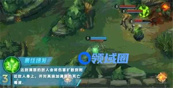 其次,如果目标身上已带有满层被动效果,那么E(3)技能还会使满层的被动效果以目标为中心,传播到周围敌人身上!端游的召唤师们,你们没有听错,手游里图奇的E(3)技能有类似AOE性质的“传毒”效果啦!