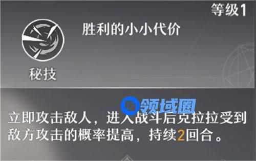 1、克拉拉的<秘技>【胜利小小的代价】,可在进入战斗前对敌方目标使用,进入战斗后可提高克拉拉受到敌方攻击的概率。