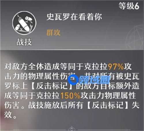 3、克拉拉的<战技>【史瓦罗在看着你】可对全体敌方目标造成物理伤害,并可通过消耗敌方目标身上的【反击标记】来提高造成的伤害。