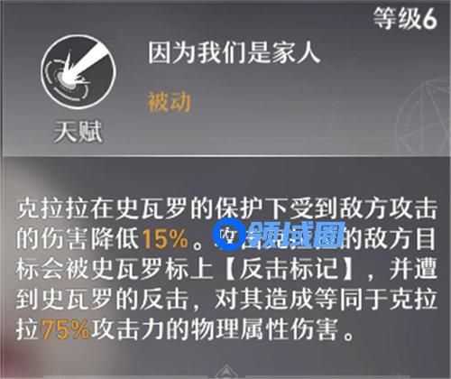 2、克拉拉的<天赋>【因为我们是家人】可降低受到的伤害,敌方目标攻击克拉拉时,克拉拉可给予目标【反击标记】,并立即释放反击。