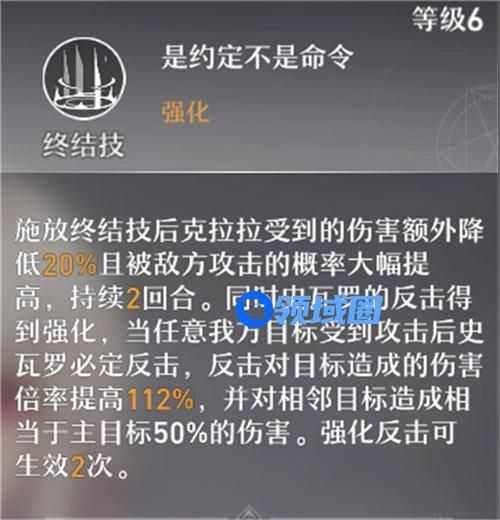 4、克拉拉使用<终结技>【是约定不是命令】后,减少受到伤害的同时提升被敌方攻击的概率,并强化【反击】的伤害。我方任意角色收到攻击时,克拉拉均可释放反击,并对相邻的目标造成伤害。