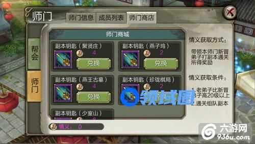 师门商店需要消耗情义才能购买,可以购买副本的次数,其中最好的副本就属聚集贤庄和少室山副本最好,掉装备嘛。情义的获取条件是带领本师门等级相差20级的玩家一起下组队副本,这样带小号再也不会感觉吃过亏了!