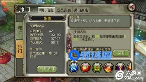 加入师门最大的好处就是能学习一个新的技能,师门技能一共有六种,不过很可惜,一个师门目前只能激活一种技能,所以各位师门掌门得自己定夺。激活技能和学习技能都需要消耗薪火,而薪火只要在线就能获取,跟真气获取类似。激活技能需要消耗掌门的个人薪火,一个技能需要消耗1000多薪火,小编一直感觉这里很坑,为什么不是消耗师门薪火呢。这里推荐学习血量上限这个技能。师门技能学习后,还能在角色技能那边升级,就跟其他技能升级一样,不过消耗的是薪火就是。 下面上几张师门的技能图。