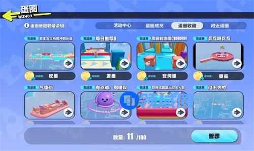- 蛋圈收藏:珍贵收藏分享给最好的朋友!蛋圈中所有蛋仔们收藏的地图将会在此展示,每位蛋仔最多5张地图,蛋圈内所有成员均可点击游玩!乐园地图挑花眼?不如看看大家的推荐吧!