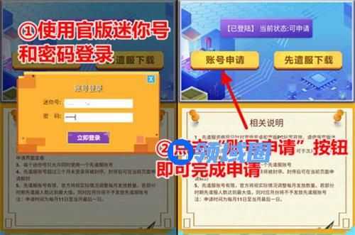 1、点击上方按钮前往先遣服申请地址,在页面上登录官版迷你号后,点击“账号申请”即可,申请时间为每月11日至当月最后一日。