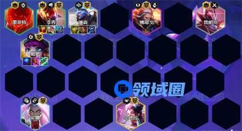 8人口大搜找到辛德拉开出6爱心羁绊,后期辛德拉拉怪是阵容的主要上限,可以不考虑拉9人口,尽可能在场下多放怪兽英雄,像费德提克>厄加特>莫甘娜>拉莫斯,后期需要这些怪兽卡来补充控制。