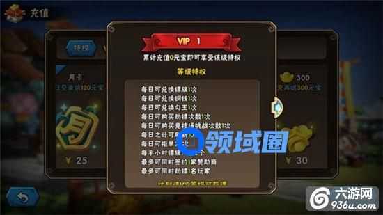累计充值0元宝即可享受该级待遇。达到该VIP等级可获得铜钱*10000,酱猪蹄*3,技能书*30,锡矿石*50。