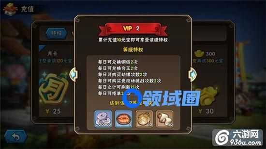 累计充值10元宝即可享受该级待遇。达到该VIP等级可获得铜钱*20000,酱猪蹄*5,铜腰牌*10,麻布*50。