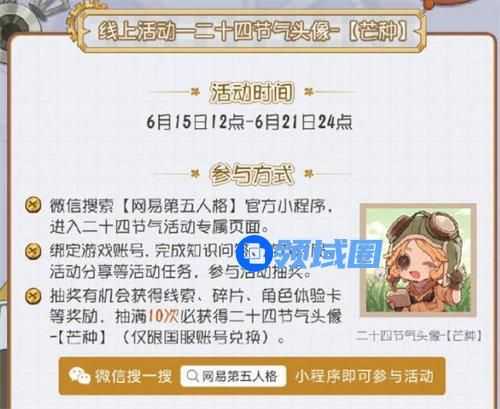 微信搜一搜【网易第五人格】官方小程序,进入二十四节气活动专属页面,绑定游戏账号、参与活动并完成任务,参与活动抽奖,抽满10次必得二十四节气头像-【芒种】。