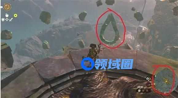 5、“空鱼之地”是天空中像鱼的一片浮岛,站在岛正中间,向西南方向看,有一些碎岩 组成了 水滴的形状。把“王的鳞片”附在弓箭上射出去穿过水滴。