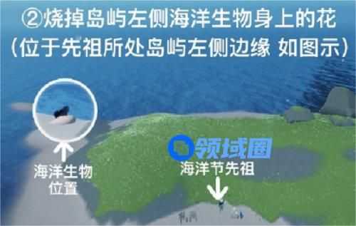 2.烧掉岛屿左侧海洋生物身上的花,位于先祖所处岛屿左侧边缘如图示。