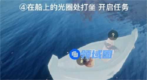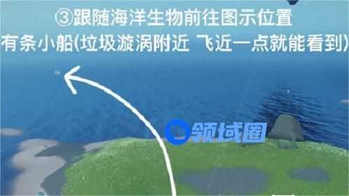 3.跟随海洋生物前往图示位置有条小船,垃圾漩涡附近飞近一点就能看到。