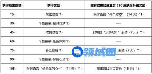 活动奖励:甜蜜冒险主页装扮(15天)*1、安琪拉“没事吧?”表情(7天)、亚瑟“我错了”表情(7天)、限时语音“你个皮皮”(14天)、限时语音“偷走你的心”(14天)、个性戳戳-怦然心动*2等