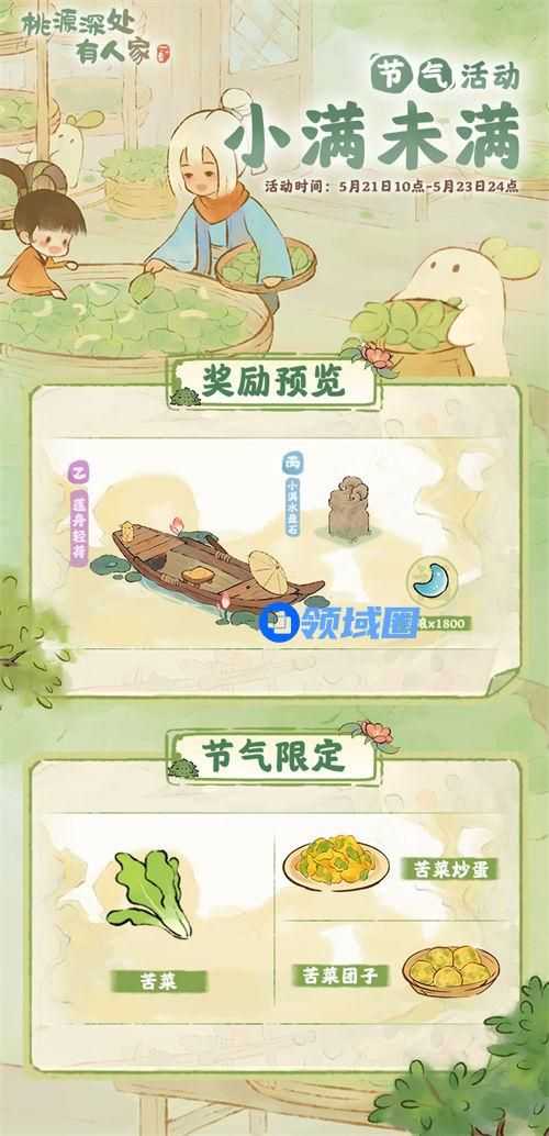 桃源深处有人家在5月21日即将开启有趣的小满未满节气活动,玩家参加其中即可获取各种节气限定的菜品配方和特色食材,满足小满节气特点的食材为苦菜,活动期间每个玩家都能完成任务得到。除此之外还有玥琅1800个,限定的建筑也少不了。感兴趣的玩家别错过游玩活动即可。官方再向玩家介绍和节气有关的知识的同时带来了不错的玩法内容,游玩的过程中认识更多的美食佳肴,知晓一些美食制作所需的材料有哪些,在这里度过难忘的一段时光,接下来为大家介绍一下桃源深处有人家小满未满节气活动奖励一览。