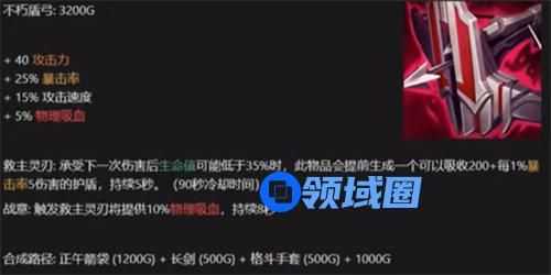 救主灵刃:承受下一次伤害后生命值可能低于35%时,此物品会提前生成个可以吸收200+ 每1%暴击率5伤害的护盾,持续5秒。(90秒冷却时间)