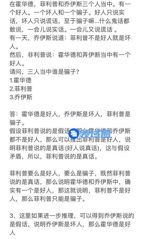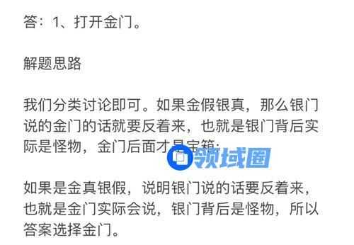 这两扇门中,有一扇门只会说真话,而另一扇门则只会说谎话:有一扇门背后是财宝,而另一扇门背后则是远古的怪物根据藏宝图上的记载,两扇门只会回答一个问题。