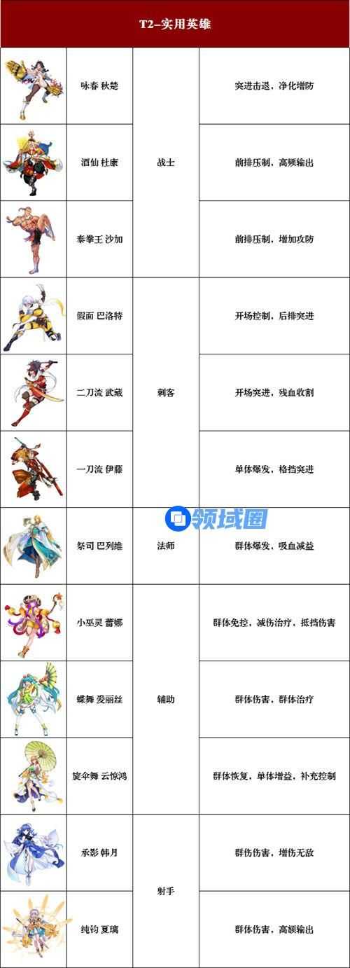 T2:实用英雄。上场率一般,但也可作为队伍核心来使用,综合强度较好;