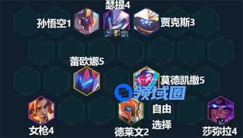 莎弥拉+蕾欧娜+女枪+稻草人+铁男+辛德拉+盖伦+艾克+德莱文组成4精英战士3战斗机甲2秘术卫士2星之守护者的羁绊。
