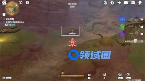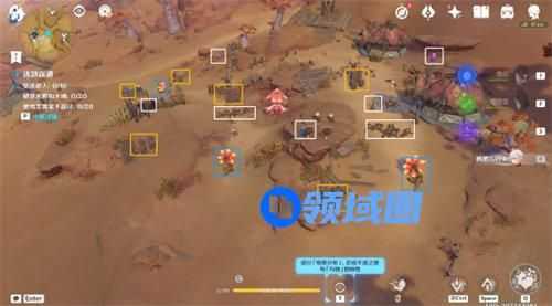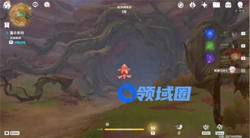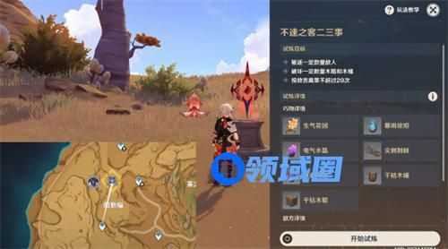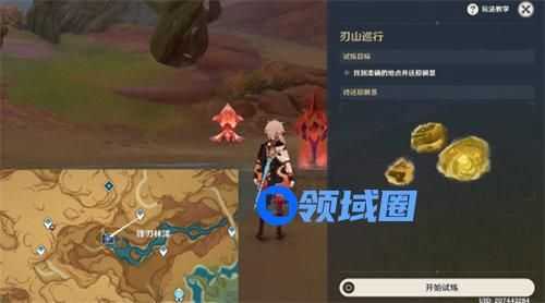 2、斯露莎投掷「苦离果」,命中「巧物」,驱逐所有丘丘人,开启试炼,往地图的西南方向看;