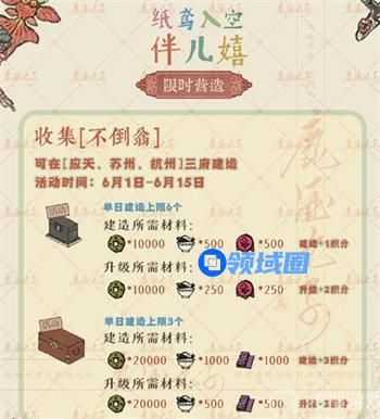 1.江南百景图纸鸢入空伴儿嬉活动建筑可在应天、苏州、杭州三府建造,收集不倒翁。