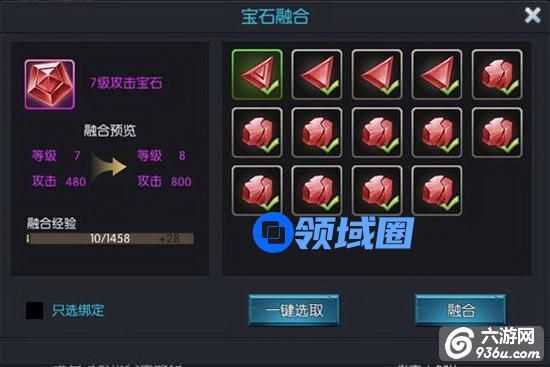 在融合界面和点击选中对应的宝石点击融合,提升已镶嵌宝石的等级。