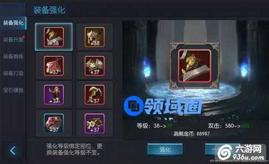 从人物处打开功能大厅,选择装备功能,第一个就是装备强化,装备强化消耗游戏币,每次强化必定成功,是前期提升实力的重要途径。