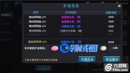 护送圣龙每周限定时间开启(具体开放时间请查看游戏活动公告),家族成员通过“物资募集”界面投放金币或者钻石可购买“龙蛋”参与护送任务,龙蛋的 品质将会根据投放的金币或者钻石的数量而有所区别。物资募集结束后可由族长或者副族长开启护送任务,届时圣龙将由族长或者副族长牵引朝着护送目标前进。护 送的途中需要经过几个任务点,在经过中间某些任务点时龙蛋会有概率发生变异从而品质得到提升。护送结束之后成员可以领取所护送的龙蛋,点击使用即可获得龙 蛋中所包含的奖励。