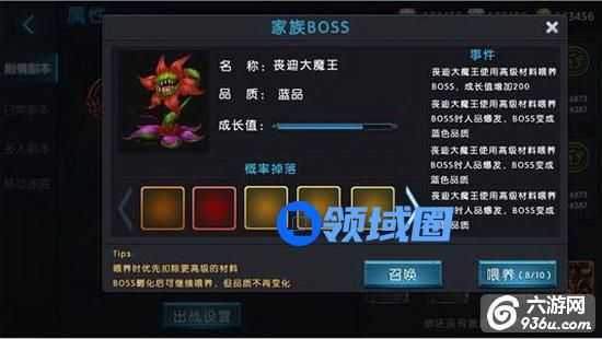 家族族长或者副族长可以在家族地图当中找NPC“驯兽师”领取BOSS未孵化的蛋进行培养。BOSS蛋会出现在家族BOSS界面当中,所有家族成员 均可在庄园中采集“神兽孵化草”来培养BOSS。培养的过程中BOSS会增加成长值,同时会有概率发生变异提升品质。品质越高的神兽孵化草单次喂养给 BOSS提供的成长值越高,BOSS变异提升品质的概率也会越高。当BOSS成长值满后会破壳变成家族BOSS,此时可由族长或者副族长将其召唤在家族地 图中进行击杀。参与击杀家族BOSS的所有家族成员均可获得击杀奖励,奖励由BOSS的品质和等级决定,BOSS的等级受家族驯兽场的等级限制。每位家族成员每天有一定的喂养次数限制。